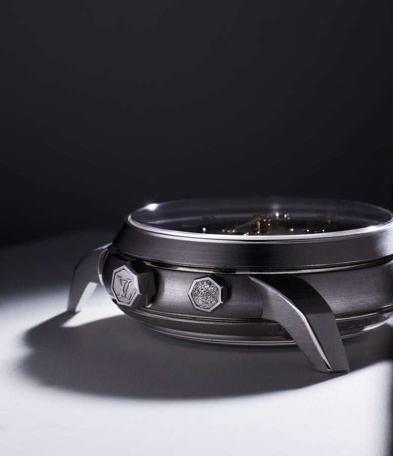 The three-part platinum case was marked by its raised bezel that did without the signature ovoid detail. The brushed profile of the case, punctuated with polished aspects, was nicely detailed and finished. The heptagon-shaped crown and monopusher, at 3 and 1 o’clock positions, referenced Louis Vuitton’s design vernacular. Turning over the case revealed the chronograph face, with the monopusher now at 10 o’clock, much like in a stopwatch.