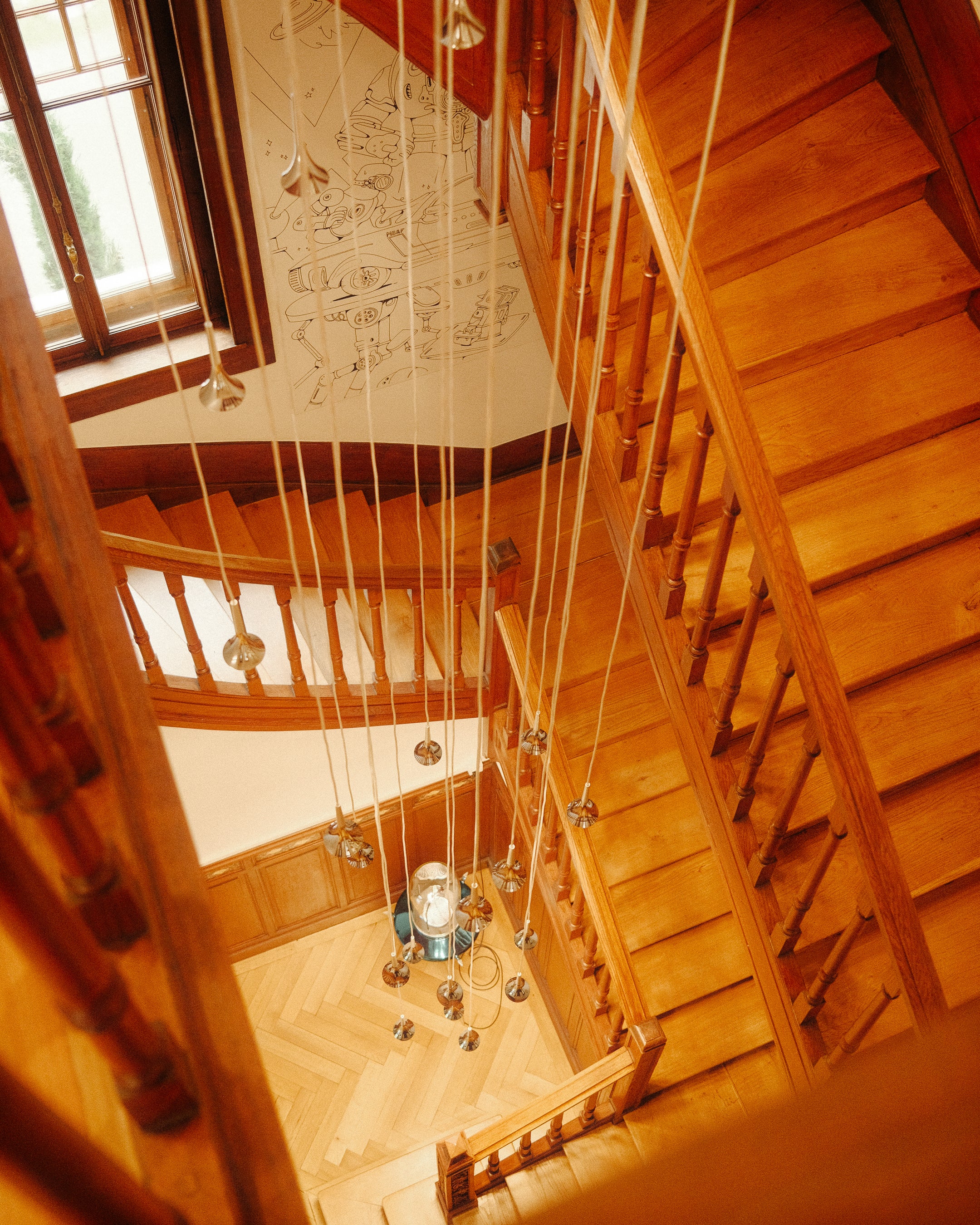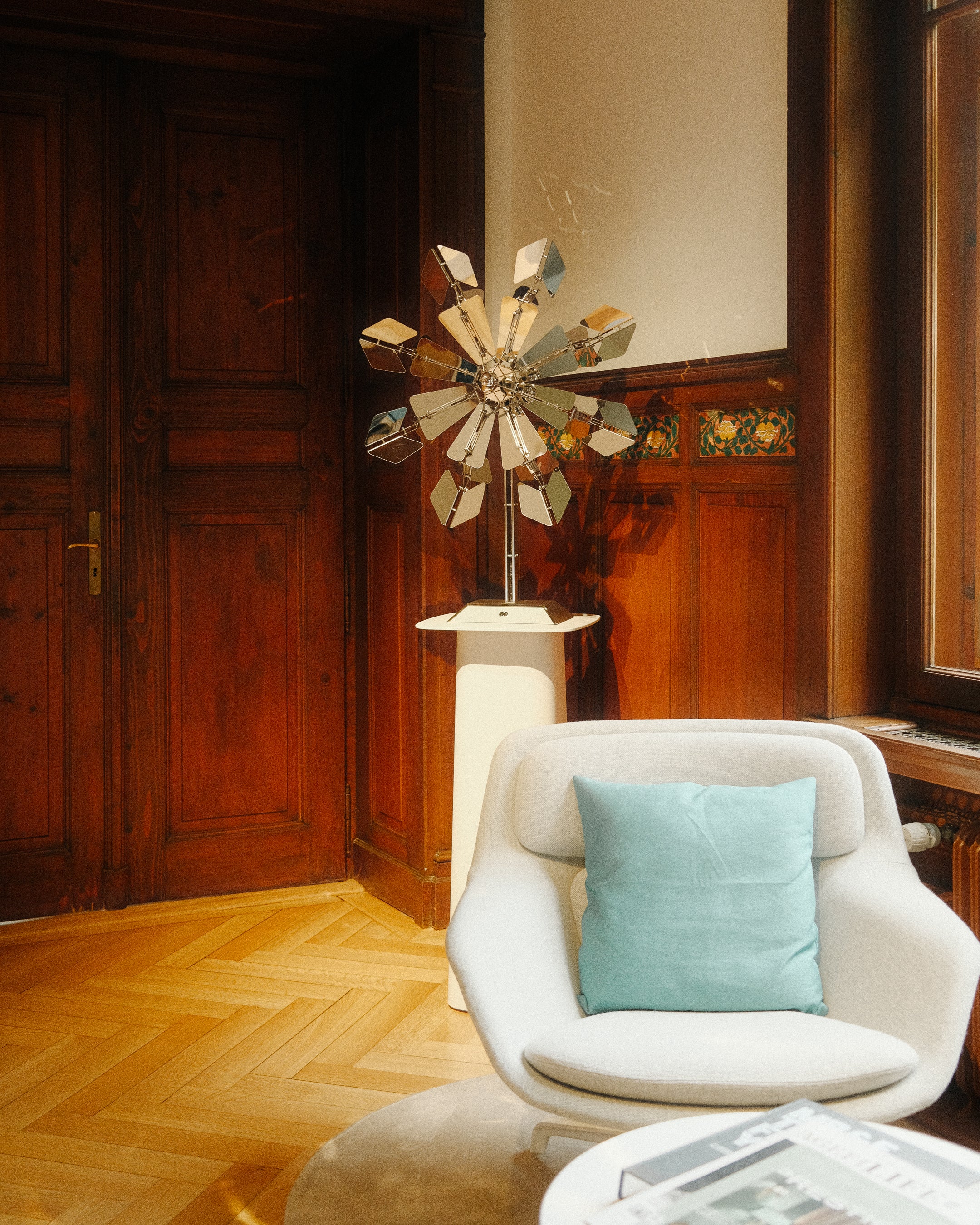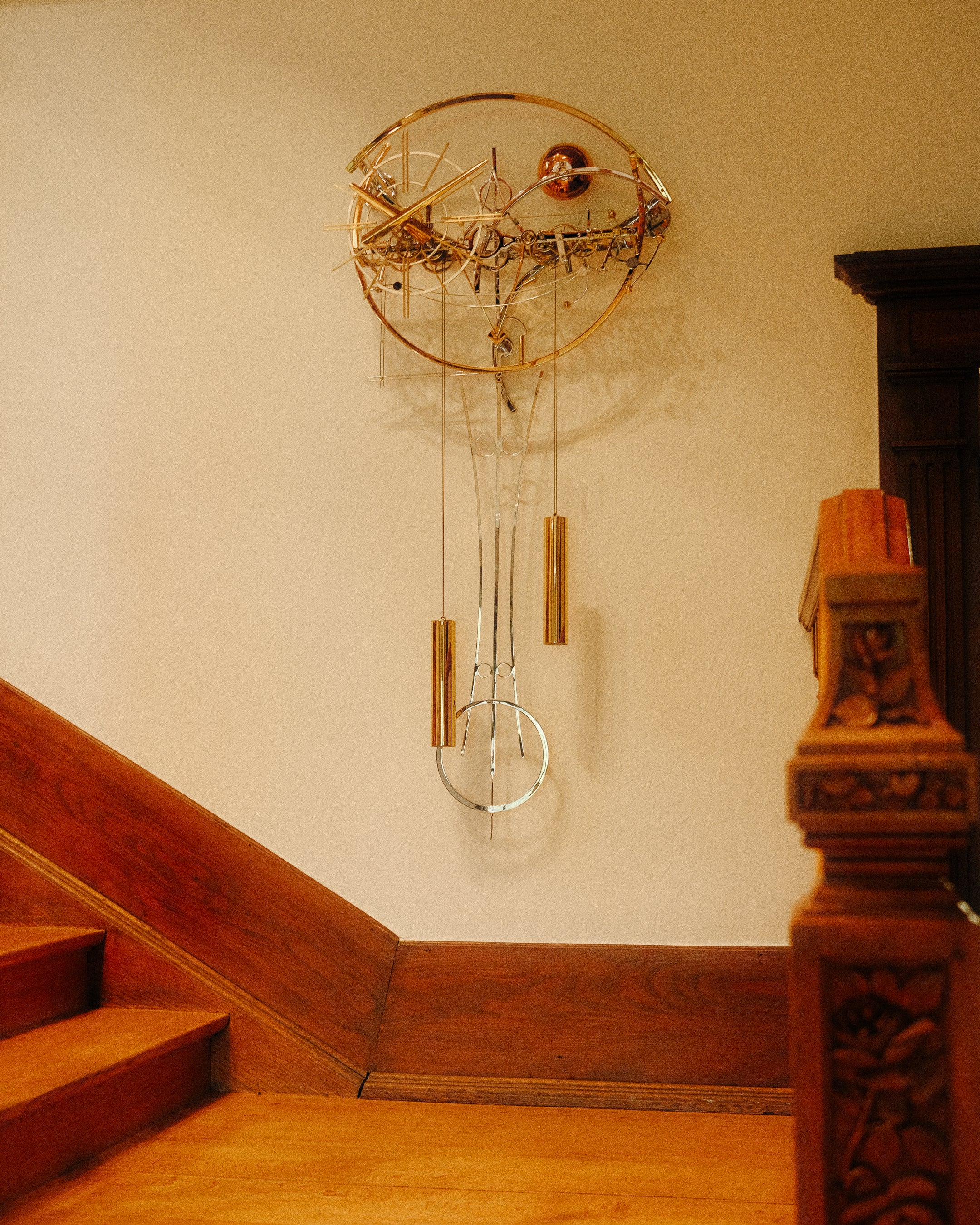 Some of the artwork found in the foyer of the workshop, a functioning openworked wall clock and a windmill-esque sculpture.
