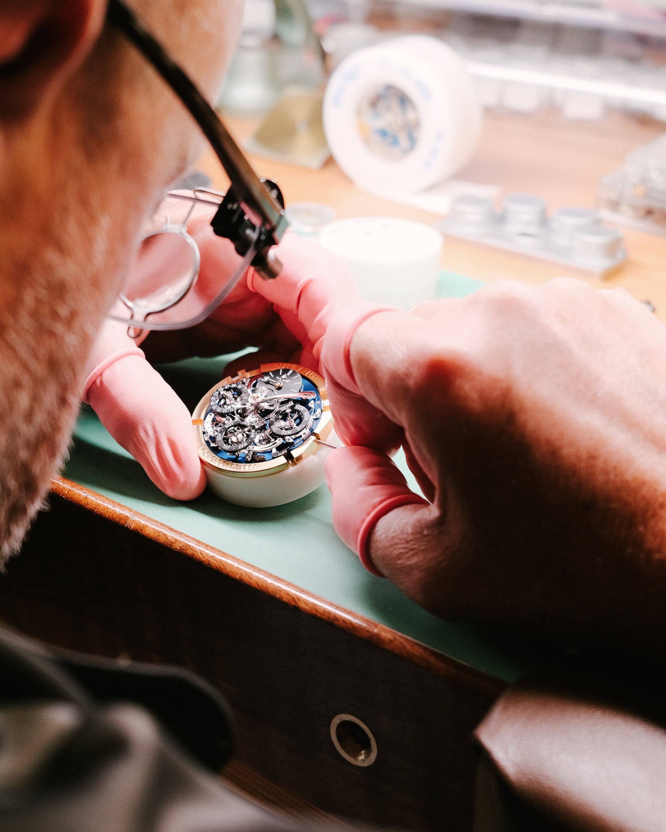 The LM Perpetual EVO in a vibrant red colourway (left). A watchmaker fine-tuning and adjusting one of their movements (right).