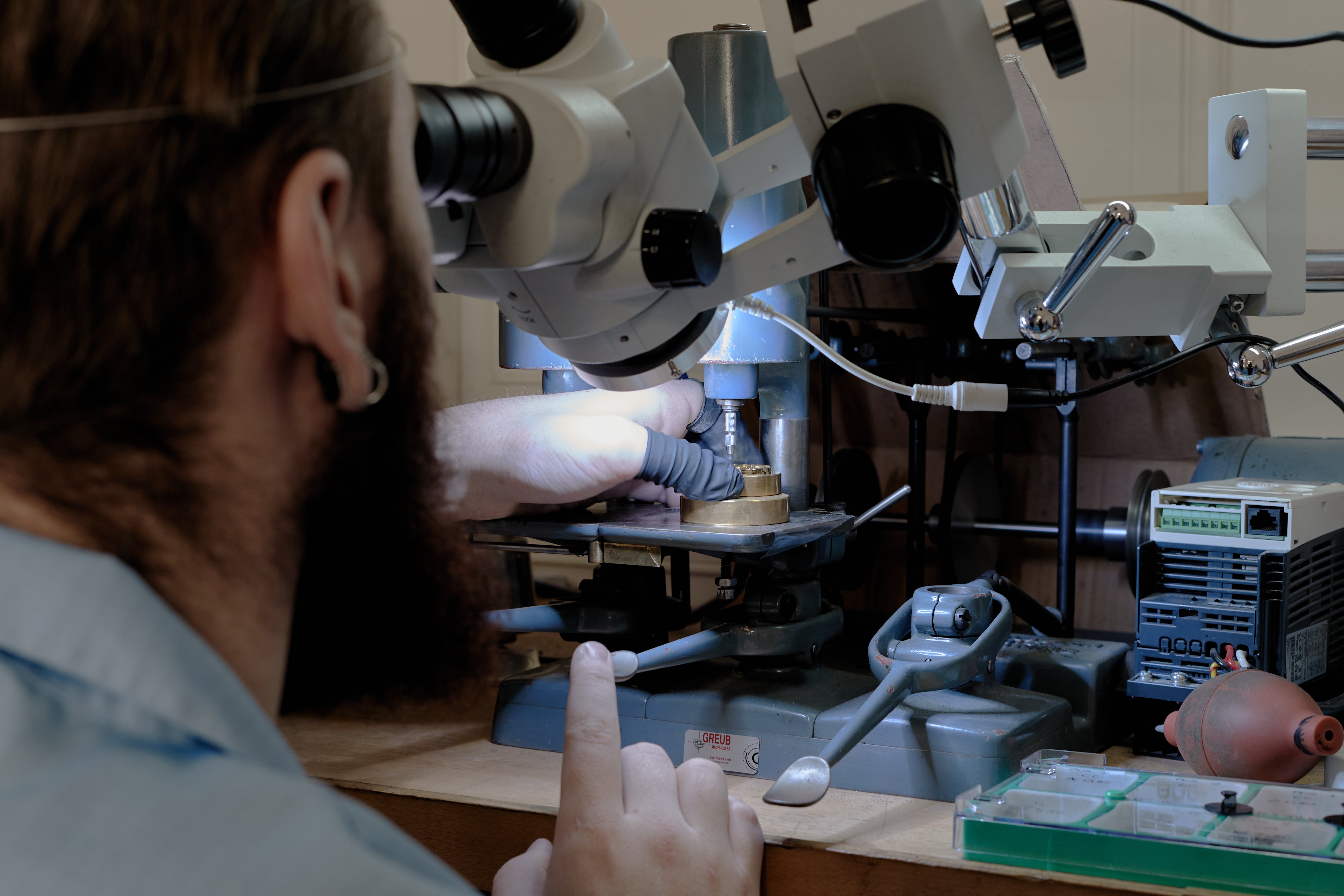 This methodical approach is mirrored in the way their workshop is organised today. As Maillat takes us through the workshop, we enter the first room, which is entirely dedicated to decoration. There is a quiet hum of focus and watchmakers working away at their machines. In this room, work is done at the microscopic level – microscopes are placed at nearly every workstation. As Maillat explains, this is where most of the finishing occurs, and a large television is placed on one wall of the room which demonstrates a blown-up feed of a watchmaker working on a movement. This is mostly for practical reasons, to teach new watchmakers and provide a larger view of the components.