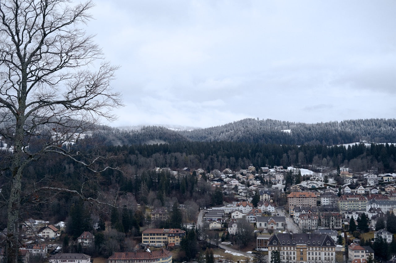 When we leave the Musée d’Horlogerie du Locle we drive on narrow, serpentine country roads cutting through the snowy landscape, avoiding the busier arterial stretch that connects Le Locle with La Chaux-de-Fonds.