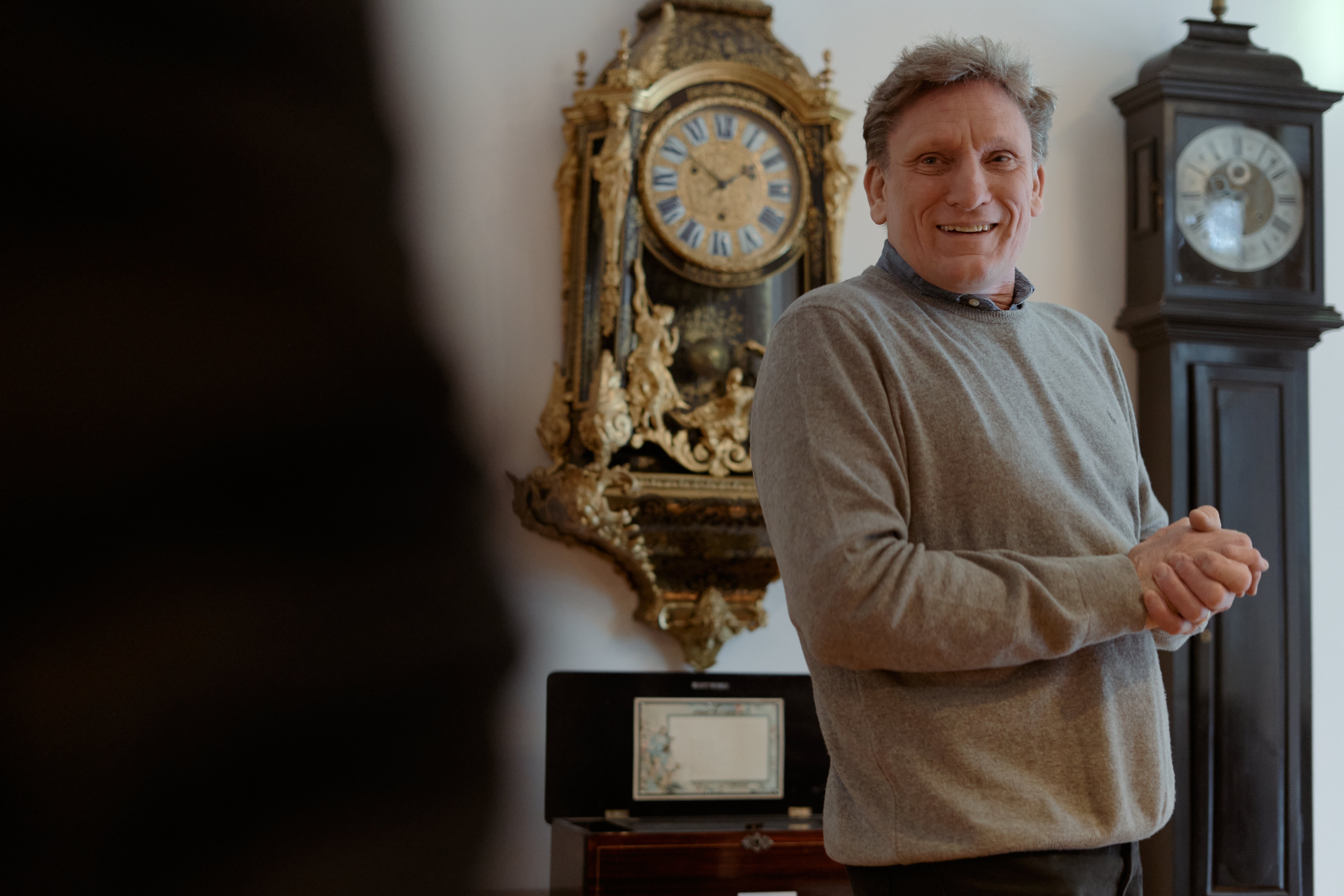 Forsey arrives a few minutes after we did. We hear him before we see him, warmly greeting the curator. He moves with an ease that suggests he is entirely at home in his surroundings and immediately assumes the role of host and guide. He gravitates towards a pendulum clock on the ground level of the museum.