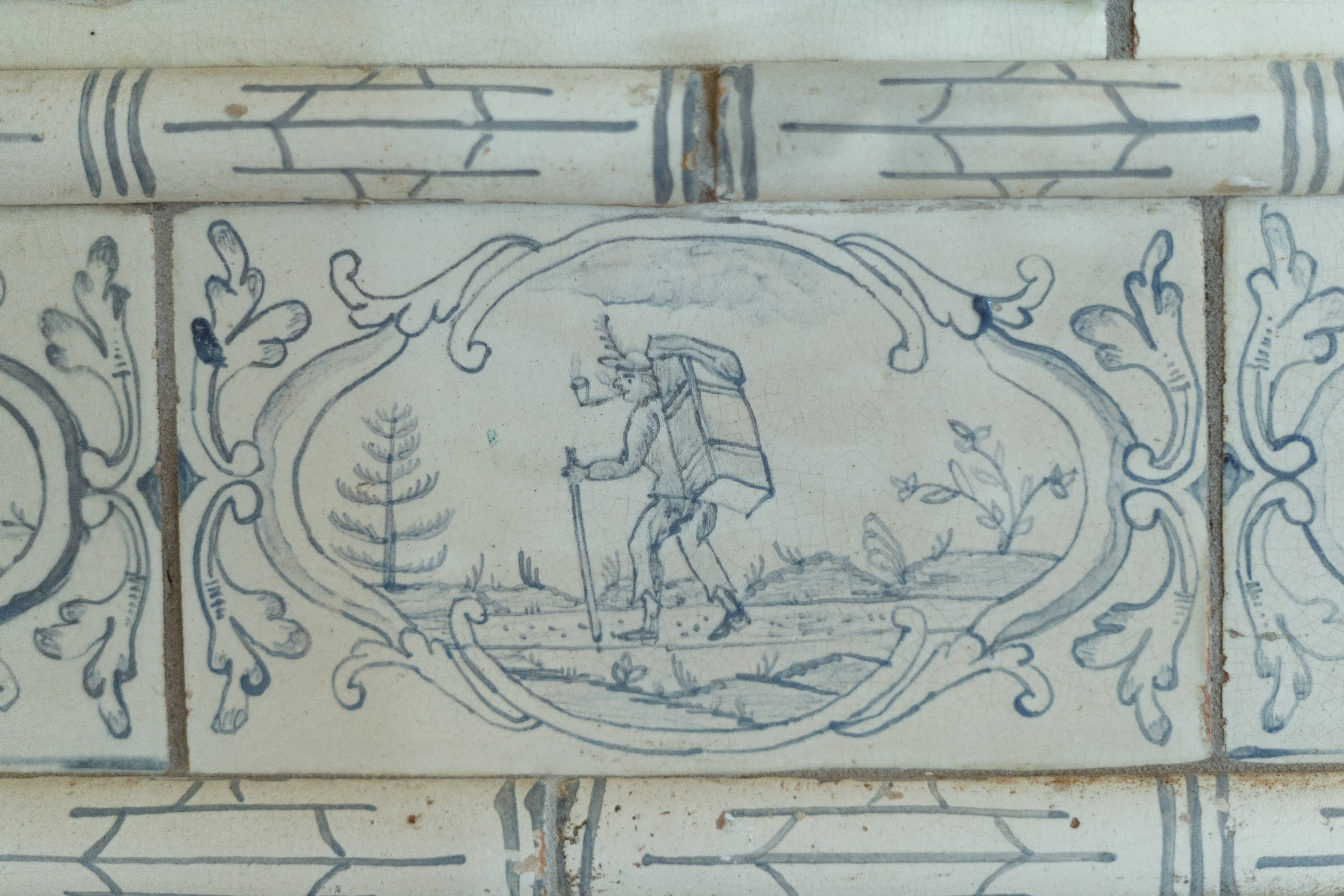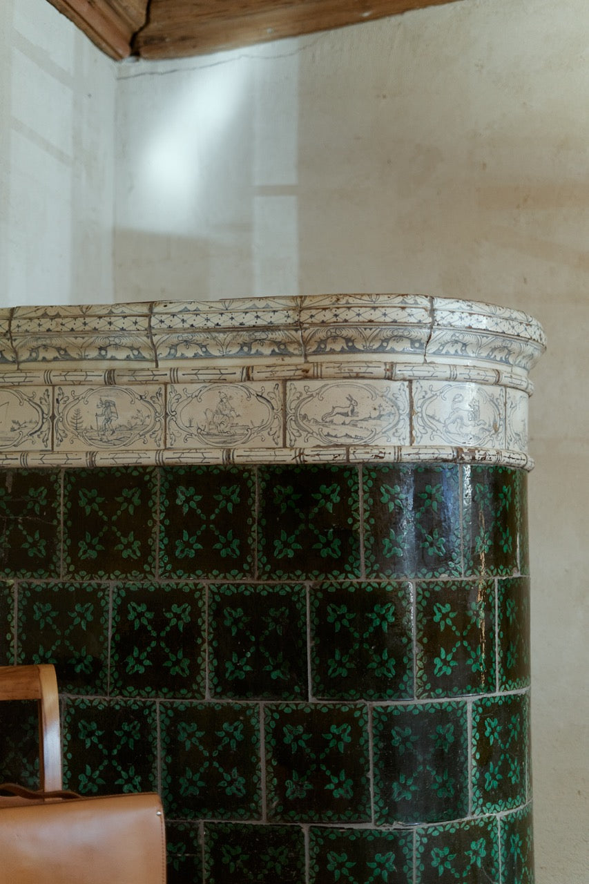 To the right of the atelier lies the original farmhouse that has stood for more than three centuries. It was carefully restored, often using bricks, tiles and wooden beams rescued from other similarly traditional farmhouses. The tiles on the furnace are one such detail. Looking closely reveals a motif of a farmer carrying a large format clock, something they could have created over the winter months, to a potential client.