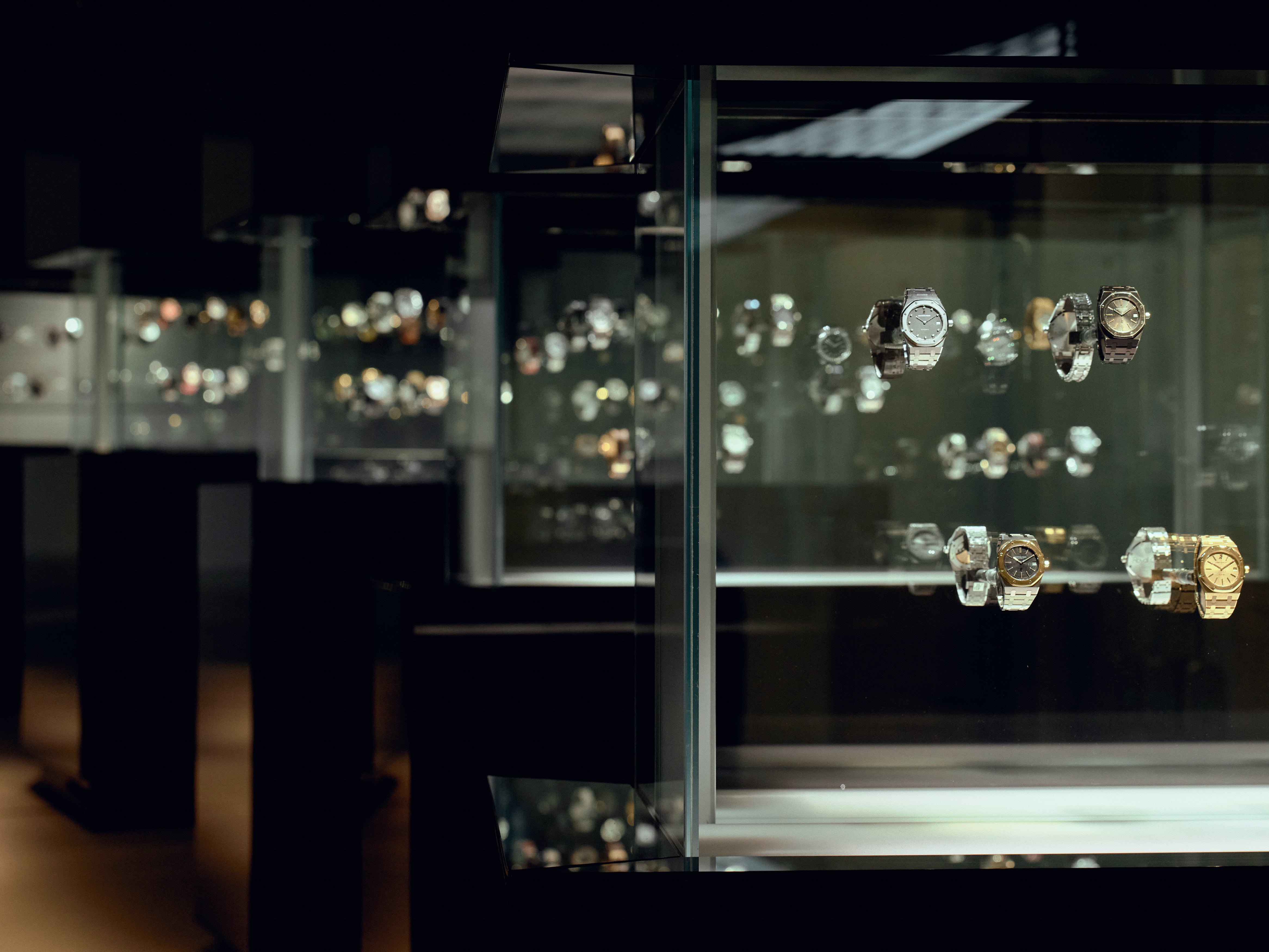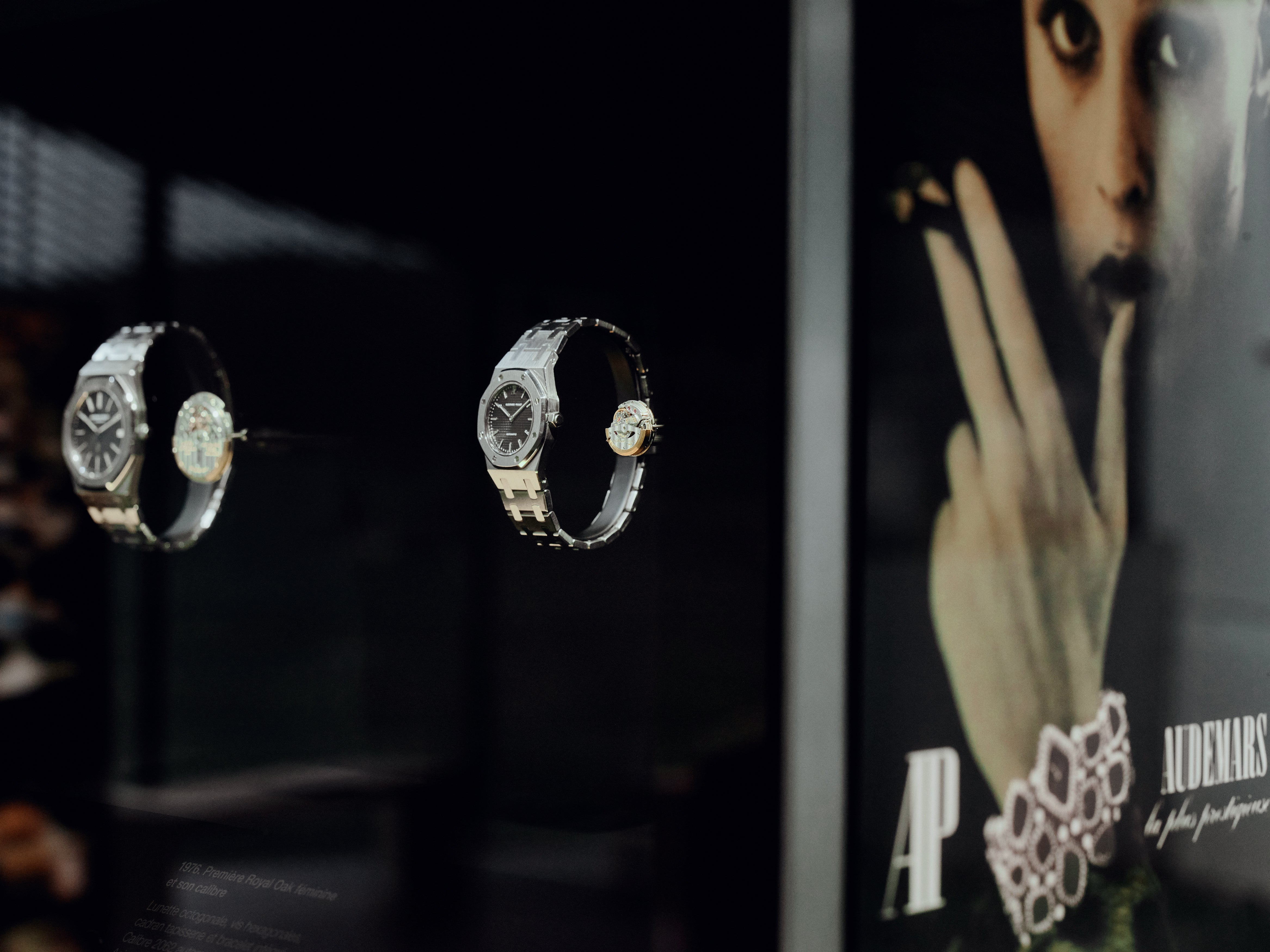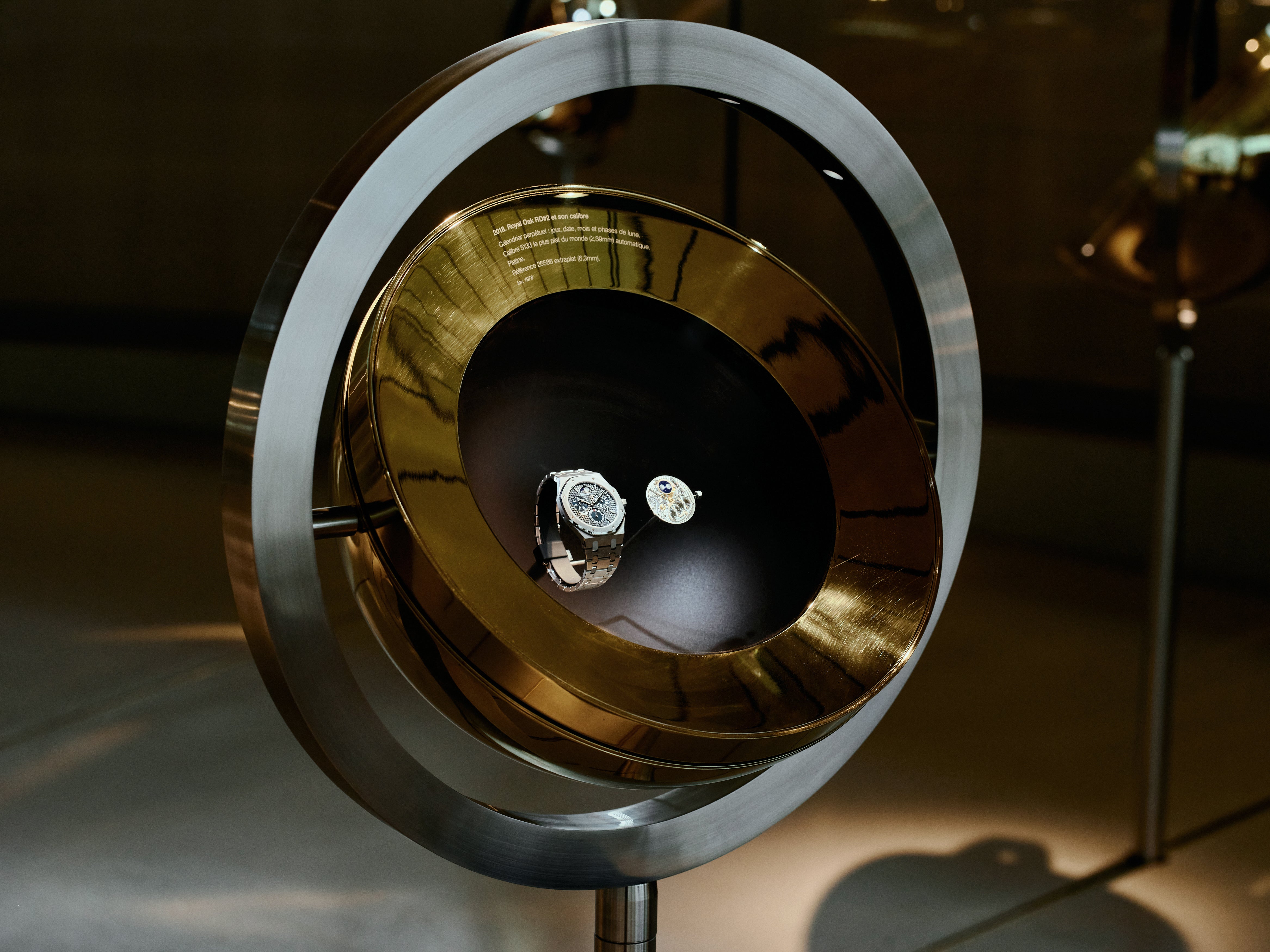 The space itself has been calibrated to a knife point of luxury, carefully giving off the impression of warmth and effortlessness, while being very thoughtfully arranged to foreground the visitor’s experience. Glass cases are interspersed with kinetic sculptures and familiar complications blown up to a larger scale to reveal how they work. The Royal Oak display takes up a significant and impressive section, complete with a dramatic reveal of black screens playing a video and lifting upwards to reveal row after row of Royal Oaks.