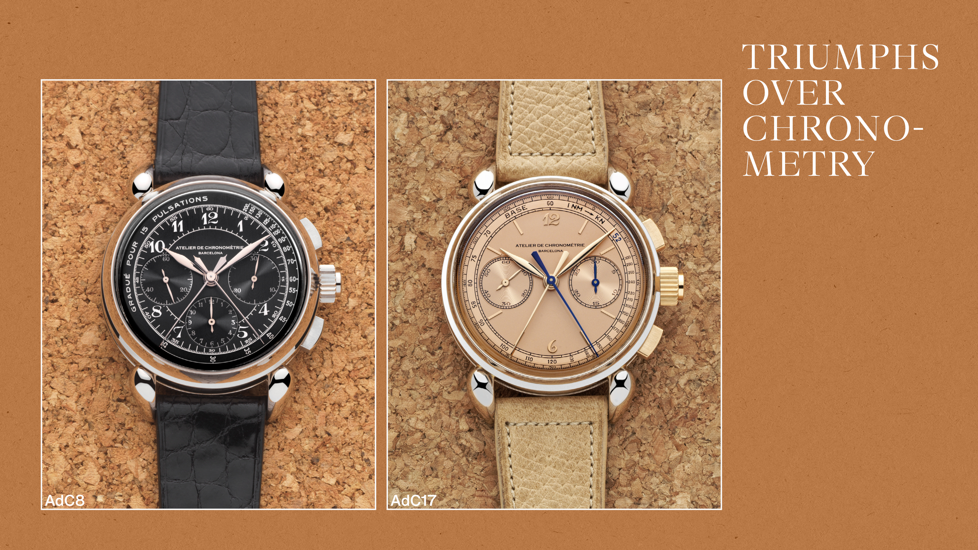 In 2020, having firmly established themselves with their time-only work, Atelier de Chronométrie ventured out of their comfort zone with the AdC 8, a split-seconds chronograph. The watch featured an entirely new case with teardrop lugs, inspired by vintage chronographs. Meanwhile, the dial had a pulsometer scale rendered in galvanic gilt on black, overall adhering closely to vintage examples, and especially reminiscent of Patek Philippe chronographs. The watch was a finalist in the GPHG awards for that year, in the chronograph category.