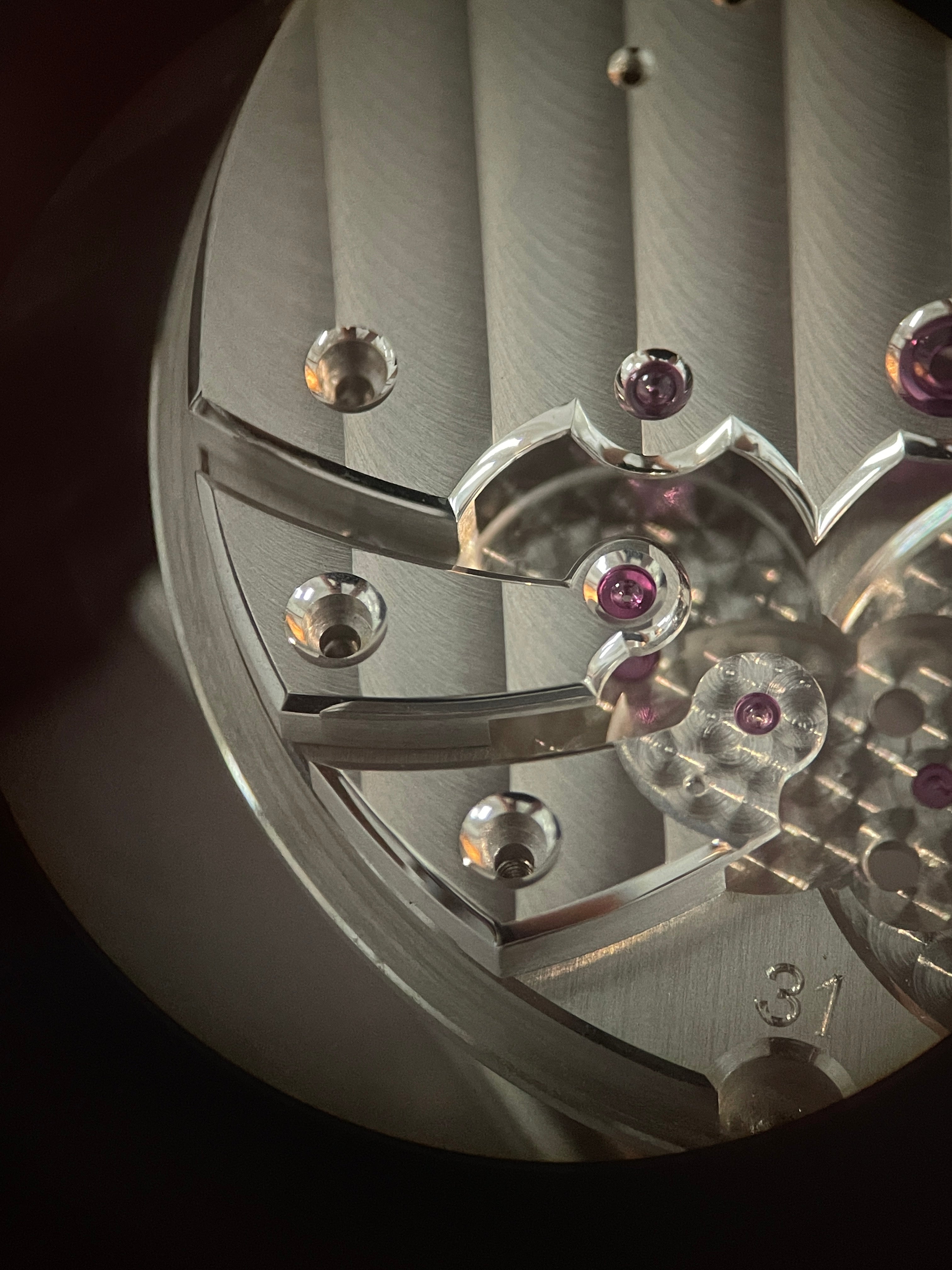 Since creating their own finishing machine, which was first put into use on the AdC 6, most of the movement finishing is done at the Atelier de Chronométrie workshop. The image on the right demonstrates the finishing on the AdC 31, with sharp bevelling, Geneva stripes, and perlage visible throughout.