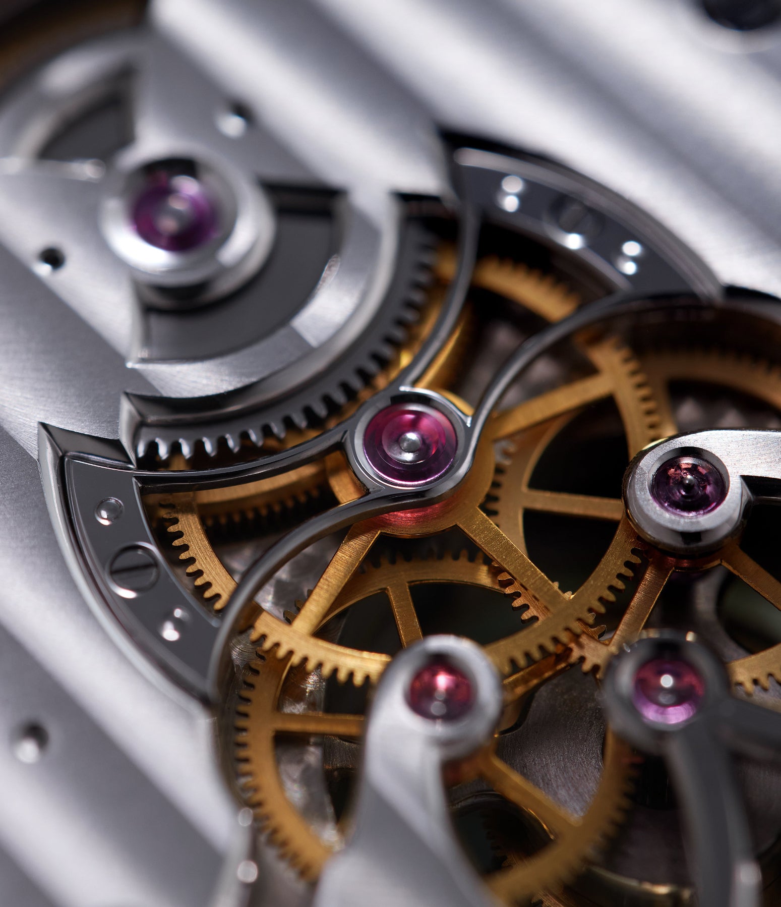 Rexhepi designed a new cage for the flying tourbillon, made of titanium and steel, weighing just 0.45g. Inside the cage was a one-minute tourbillon and together with the cage, the whole structure comprised 63 parts. The escape wheel as well as the wheels of the horizontal clutch chronograph were redesigned too.