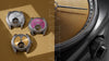 Grey, rhodium-plated baseplate; grey, hand-hammered rhodium-plated baseplate; and yellow gold-plated, hand-hammered brass baseplate