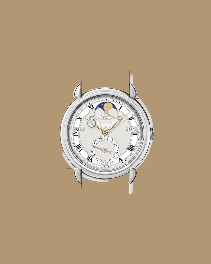 The dial was essentially the same too, both in layout and hand decoration. However, in place of the power-reserve indicator, the moonphase sector was ringed by a secondary 24-hour chapter. The complication was plied by a hand similar to the date indicator, complete with the crescent counterweight.