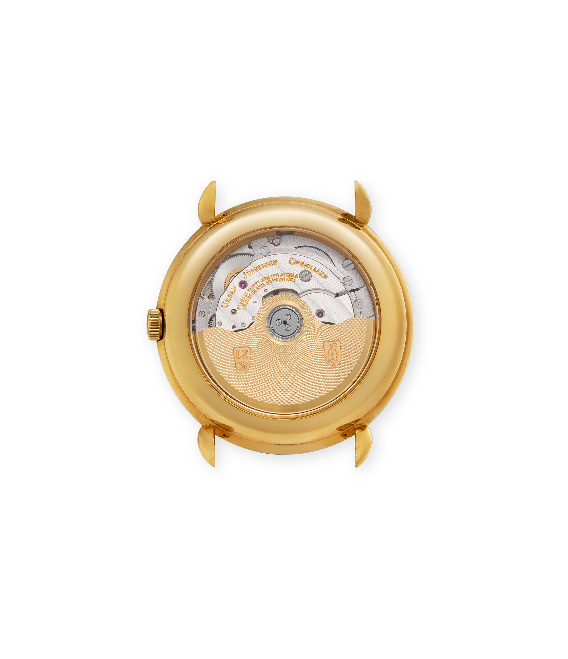 Another detail that is the hallmark of Urban Jürgensen & Sønner of this generation was a self-winding calibre. This was also the case with the Reference 5. Despite its slim profile, it was fitted with the brand’s trusted slim Frédéric Piguet calibre 71 with a solid-gold rotor, barleycorn engraving and the brand mark.
