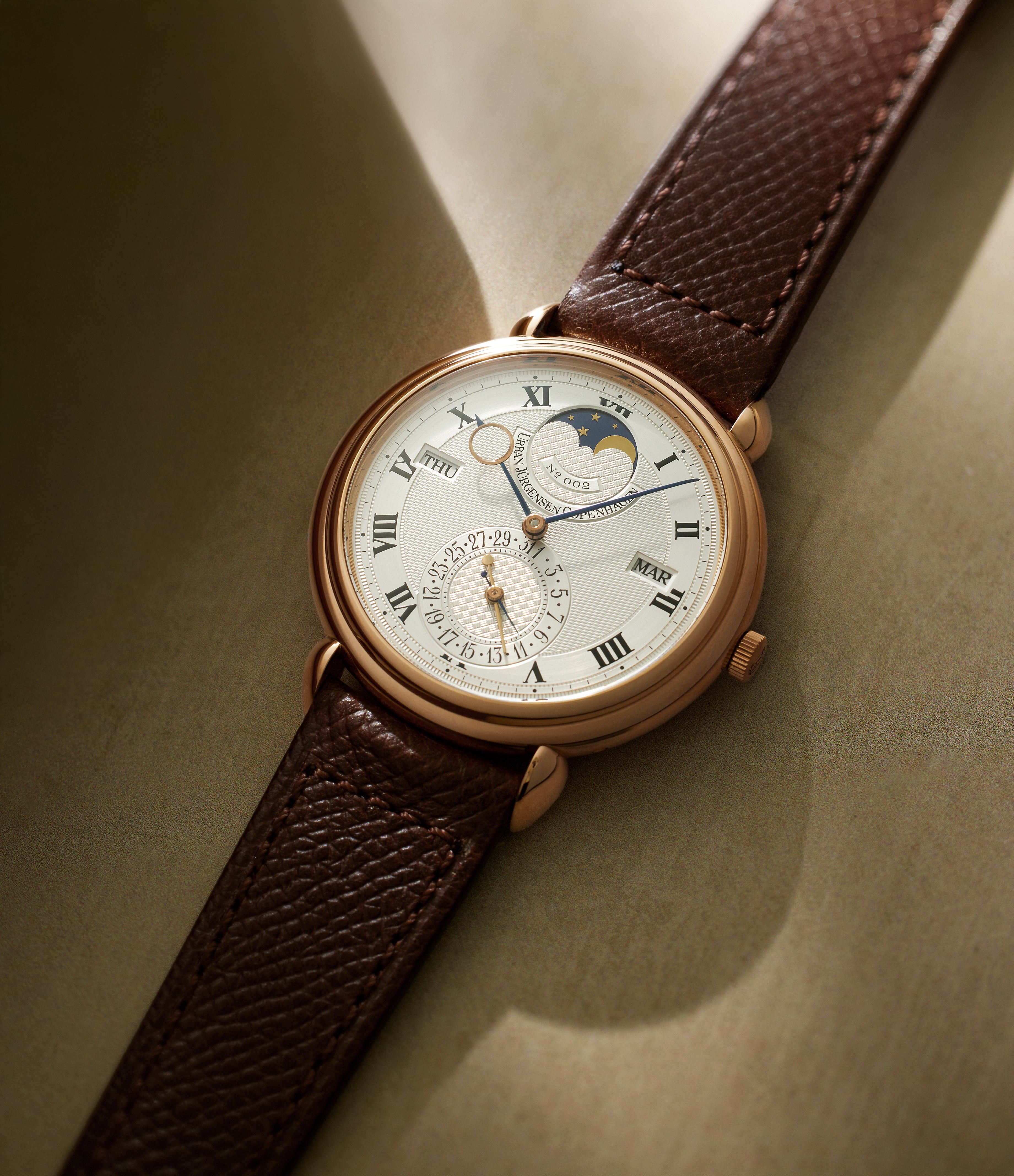 The Reference 9 is a marriage of the Reference 2 aesthetic with the layout of pocket watches such as the No. 3002 and No. 3028. Crott says, “The idea was that it would have the dial of a pocket watch with a typical perpetual calendar layout. I think there was a client who wanted this and so Peter said, ‘OK, I’ll make around 10-15 examples,’ somewhere around this number.”