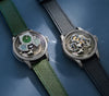 Both watches share the same movement, featuring a chiming jump hour complication, but express their individual personalities through different dial aesthetics. The movement they initially used for their school watches was the LJP 6900 Calibre by La Joux-Perret, but with their Subscription pieces, they create each movement in-house. Featuring beautiful, frosted plates and a simple yet elegant placement of the bridges, the pair draw inspiration from traditional French aesthetics.