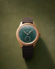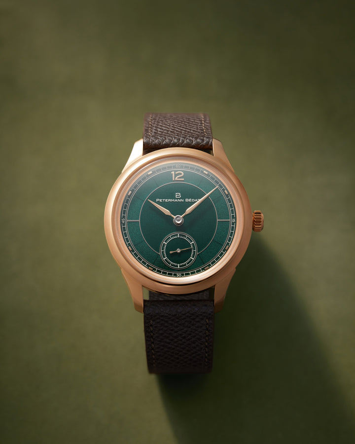 To describe the Simplicity, one must start inside out, as it is the movement that is at the core of the design. The execution is perfect and sharp, yet not overwhelming; the polished, beveled curves of the anglage add depth and contrast effortlessly with the silver finishing. Impeccably clear pink rubies do the same. The overall effect is harmonious and balanced. The two gold plates, for the maker's name and the production number, are held in place by blued screws. Balance is kept in check. The quality is uncompromising, every single part is hand-finished, even the screws and their slots are beveled. The movement features a Breguet hairspring and a large balance wheel, with adjusting weights at the two arms for micro-timing. And there is no regulator, as all Philippe Dufour watches are free-sprung. It has 52 hours of power reserve when fully wound.